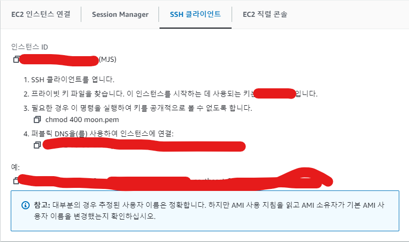 우선 SSH를 통해 인스턴스에 연결을 시도하겠습니다.